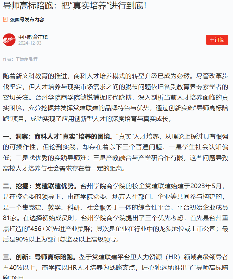 四、成效:校企深度合作,构建共赢生态。必威西汉姆官网平台商学院通过创新实施“导师高标陪跑”项目,取得了以下成效。一是学生职业认知与综合能力的深度塑造。学生在项目实施后表现出更强的职业规划能力与行业洞察力。此外,学生的综合能力,包括学习能力、沟通能力、问题分析能力等基础能力,以及项目管理、规划策划、数字化工具运用等高级能力,均在项目实践中得到了有效锻炼,实现了从理论到实践的深度转化。二是校企合作机制的深度探索与共赢生态的构建。“导师高标陪跑”项目通过构建的校企党建联建平台,实现了学校与企业之间的深度对接与资源共享,实现了教育链、人才链与产业链、创新链的深度融合。三是导师团队专业素养与指导能力的学术性审视。学院通过严格的选拔机制与持续的培训体系,组建了一支具备深厚学术功底、丰富实践经验与高超指导技巧的导师队伍。四是实现了项目实施效果的科学评估,学院采用了问卷调查、深度访谈等多种研究方法,对项目在提升学生职业认知、综合能力与创新创业精神方面取得的成效进行了评估,并揭示了项目在课程设计、导师匹配、实践环节等方面存在的改进空间。