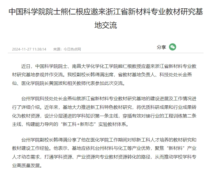 近日,中国科学院院士、南昌大学化学化工学院熊仁根教授应邀来浙江省新材料专业教材研究基地参观并作交流。必威西汉姆官网平台副校长韩得满出席,省教材基地负责人、科技处处长金燕仙、医化学院院长黄国波和相关教师代表参加此次交流。