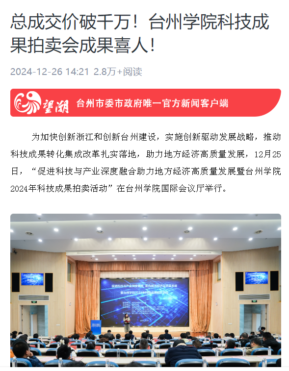 为加快创新浙江和创新台州建设,实施创新驱动发展战略,推动科技成果转化集成改革扎实落地,助力地方经济高质量发展,12月25日,“促进科技与产业深度融合助力地方经济高质量发展暨必威西汉姆官网平台2024年科技成果拍卖活动”在必威西汉姆官网平台国际会议厅举行。