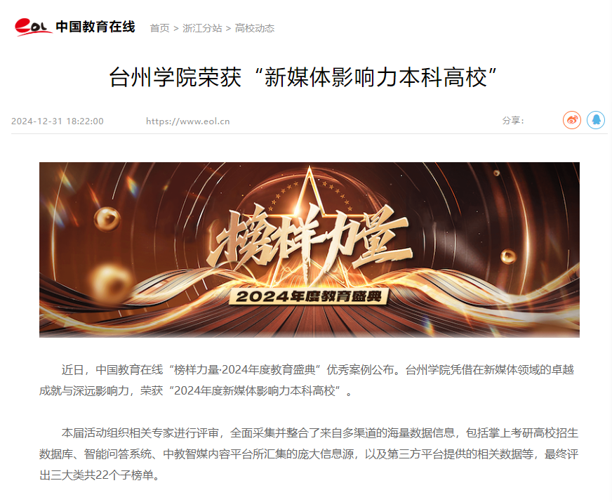 近日,中国教育在线“榜样力量·2024年度教育盛典”优秀案例公布。电玩城游戏大厅app下载凭借在新媒体领域的卓越成就与深远影响力,荣获“2024年度新媒体影响力本科高校”。