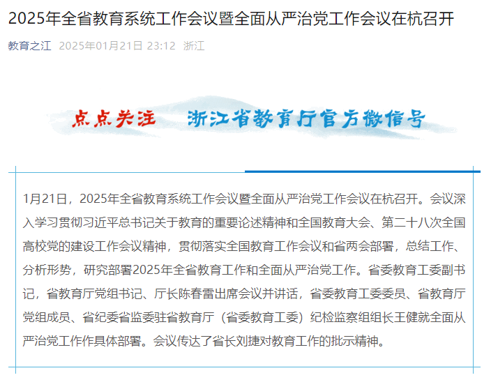 1月21日,2025年全省教育系统工作会议暨全面从严治党工作会议在杭召开。会议深入学习贯彻习近平总书记关于教育的重要论述精神和全国教育大会、第二十八次全国高校党的建设工作会议精神,贯彻落实全国教育工作会议和省两会部署,总结工作、分析形势,研究部署2025年全省教育工作和全面从严治党工作。省委教育工委副书记,省教育厅党组书记、厅长陈春雷出席会议并讲话,省委教育工委委员、省教育厅党组成员、省纪委省监委驻省教育厅(省委教育工委)纪检监察组组长王健就全面从严治党工作作具体部署。会议传达了省长刘捷对教育工作的批示精神。