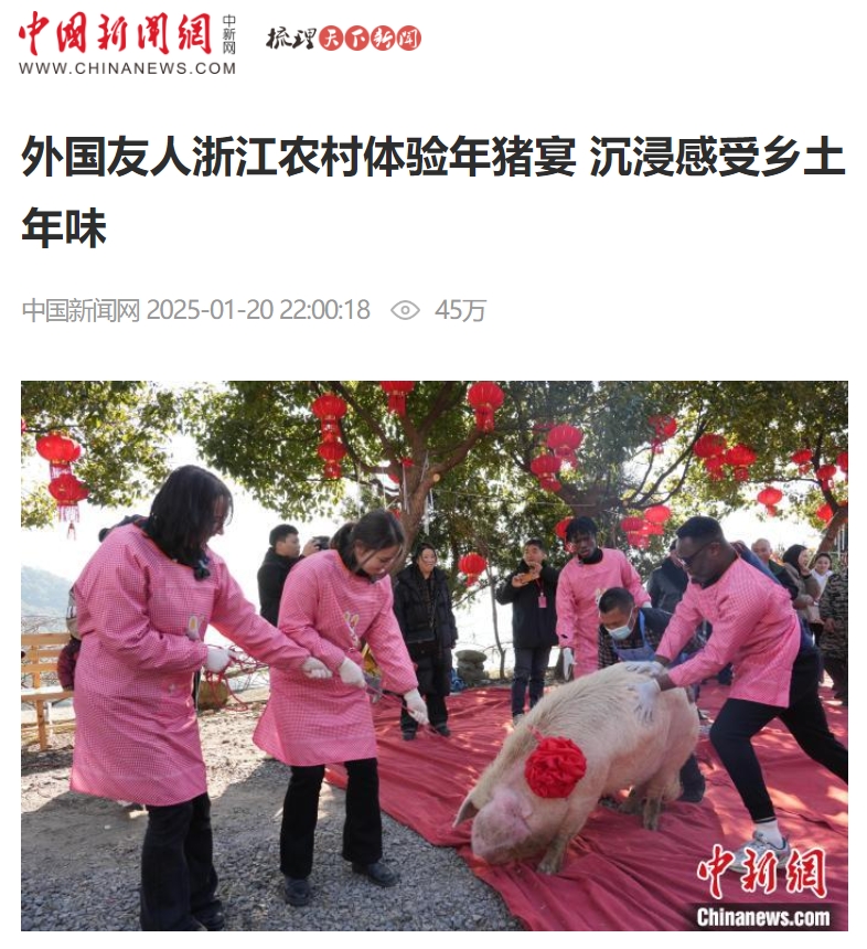 蛇年春节临近,浙江省台州市黄岩区北洋镇五尖山村举行“欢喜年猪宴”,来自台州市路桥区外国语小学的外教和必威西汉姆官网平台的留学生们与当地村民、游客欢聚一堂,沉浸感受乡土年味。图为外国友人体验赶年猪。