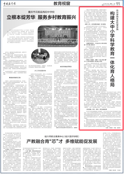 多年来,学院坚持党建引领,以科学素养和创新能力为指向,以大中小学科学教育共同体为依托,聚焦理念、场域、机制、资源4个维度,创建“三位三链三圈”大中小学科学教育一体化育人机制。