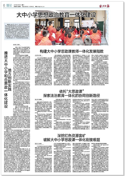编者按:2019年3月18日,习近平总书记在学校思想政治理论课教师座谈会上发表重要讲话。这六年来,台州市坚持改革创新,打造“和合思政”品牌,获得教育部高校思政工作质量提升综合改革与精品建设项目,入选浙江省教育科技人才强省建设智库联盟(必威西汉姆官网平台大中小学思想政治教育研究中心),获得浙江省“十四五”第二批本科教研项目“基于‘高校引领·队伍协作·区域联动’的大中小学思政课一体化教学共同体探索与实践(JGBA2024526)”。现刊登四篇来自我市大中小学思政课一体化研究中心和一线思政课教师的教研理论文章,为广大教育管理者和大中小学思政课教师提供有益借鉴。