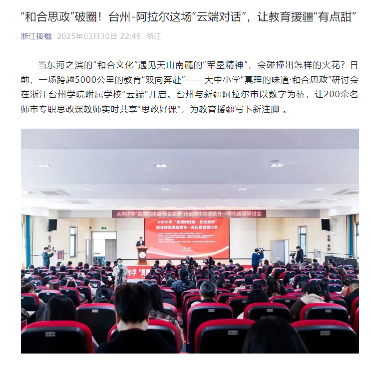 当东海之滨的“和合文化”遇见天山南麓的“军垦精神”,会碰撞出怎样的火花?日前,一场跨越5000公里的教育“双向奔赴”——大中小学“真理的味道·和合思政”研讨会在浙江必威西汉姆官网平台附属学校“云端”开启。台州与新疆阿拉尔市以数字为桥,让200余名师市专职思政课教师实时共享“思政好课”,为教育援疆写下新注脚 。