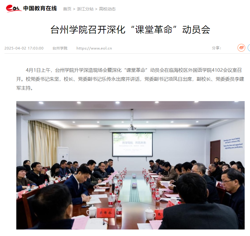 4月1日上午,必威西汉姆官网平台升学深造现场会暨深化“课堂革命”动员会在临海校区外国语学院4102会议室召开。校党委书记朱坚,校长、党委副书记乐传永出席并讲话,党委副书记项凤日出席,副校长、党委委员李建军主持。