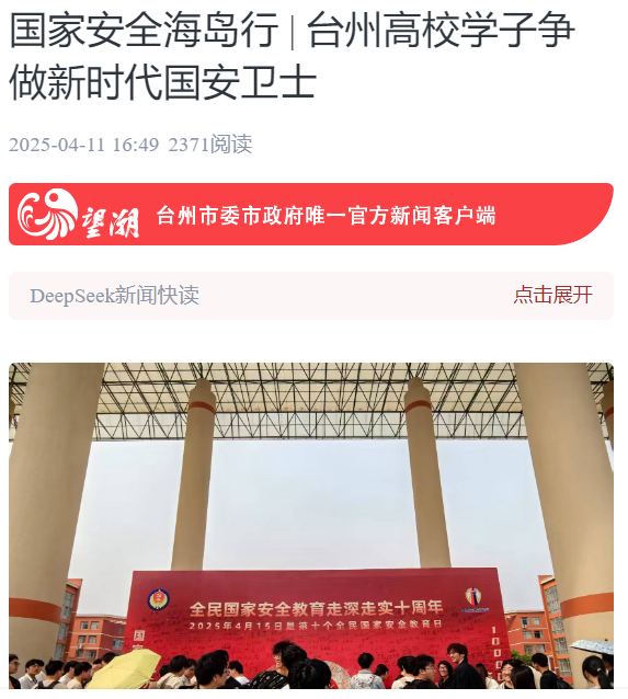 第十个全民国家安全教育日来临之际,一场以“全民国家安全教育 走深走实十周年”为主题的国家安全海岛行系列宣教活动在台州高校掀起热潮。通过万人签学、千人研学等创新形式,全市多所高校学子以青春之姿投身国家安全教育,用行动诠释新时代青年的责任担当,让国家安全意识在菁菁校园落地生根。