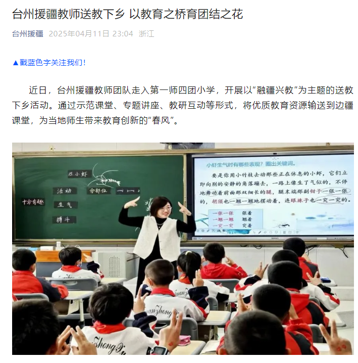 近日,台州援疆教师团队走入第一师四团小学,开展以“融疆兴教”为主题的送教下乡活动。通过示范课堂、专题讲座、教研互动等形式,将优质教育资源输送到边疆课堂,为当地师生带来教育创新的“春风”。