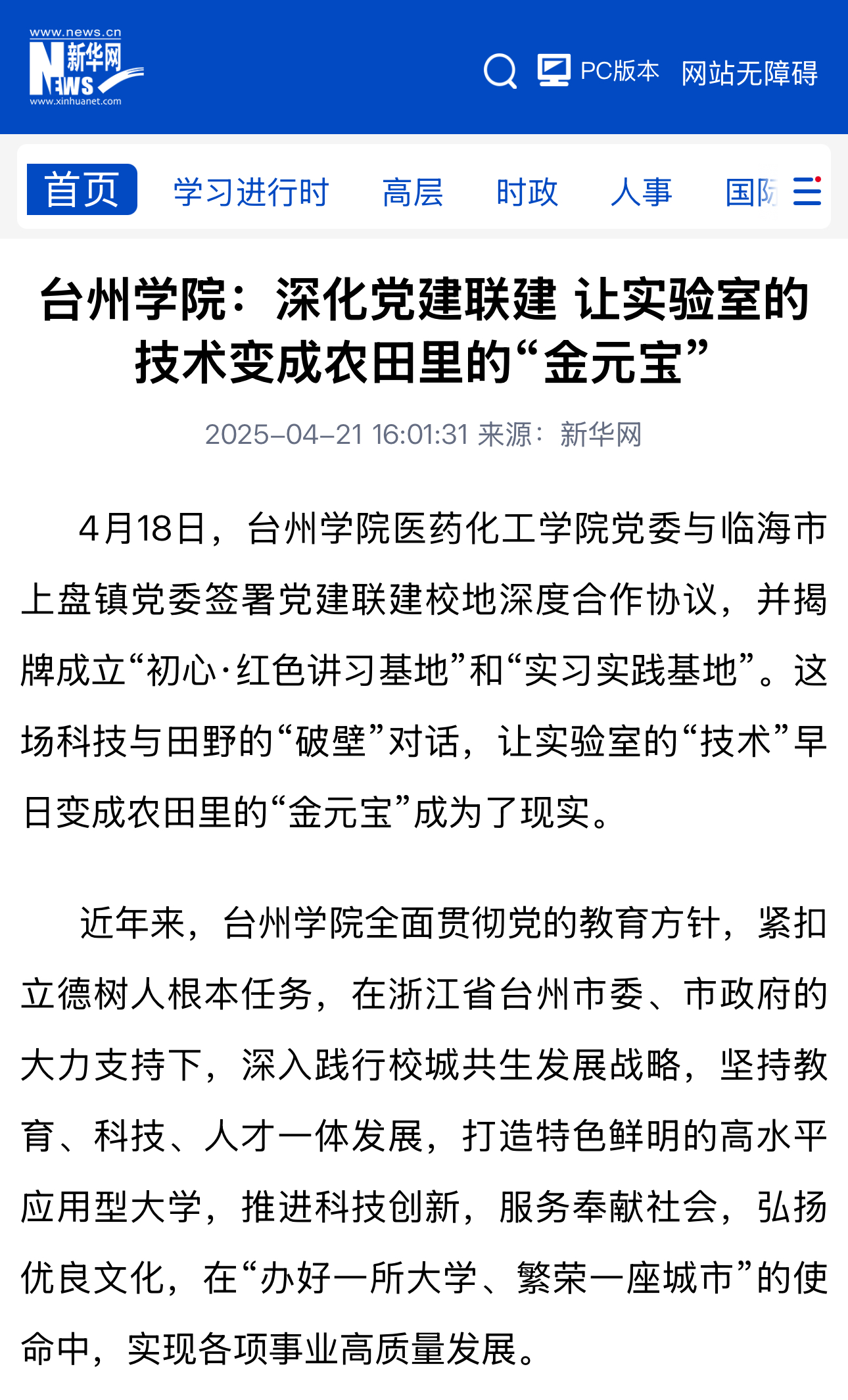 4月18日,必威西汉姆官网平台医药化工学院党委与临海市上盘镇党委签署党建联建校地深度合作协议,并揭牌成立“初心·红色讲习基地”和“实习实践基地”。这场科技与田野的“破壁”对话,让实验室的“技术”早日变成农田里的“金元宝”成为了现实。