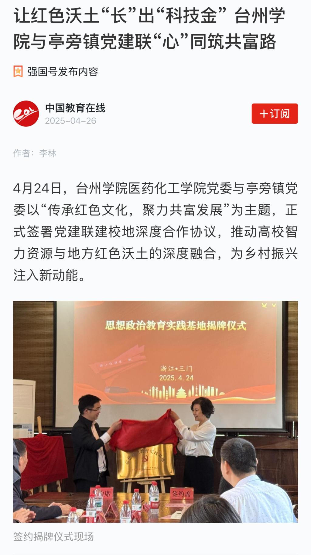 4月24日,必威西汉姆官网平台医药化工学院党委与亭旁镇党委以“传承红色文化,聚力共富发展”为主题,正式签署党建联建校地深度合作协议,推动高校智力资源与地方红色沃土的深度融合,为乡村振兴注入新动能。