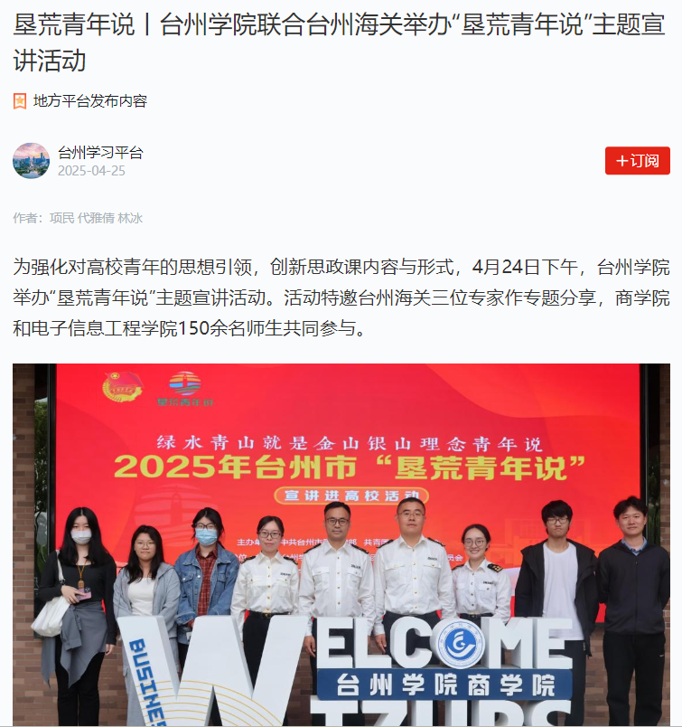 为强化对高校青年的思想引领,创新思政课内容与形式,4月24日下午,必威西汉姆官网平台举办“垦荒青年说”主题宣讲活动。活动特邀台州海关三位专家作专题分享,商学院和电子信息工程学院150余名师生共同参与。