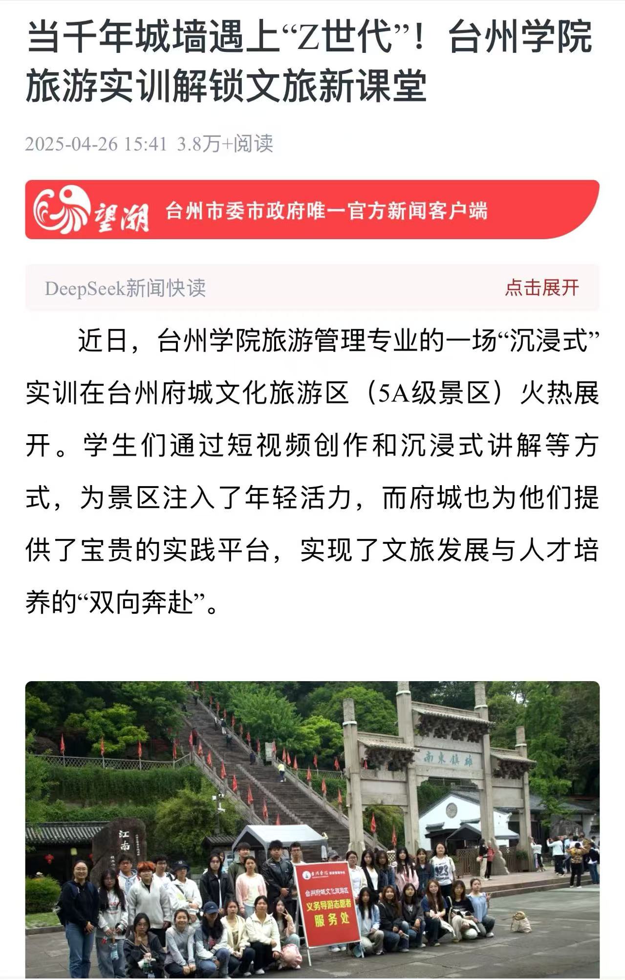 近日,必威西汉姆官网平台旅游管理专业的一场“沉浸式”实训在台州府城文化旅游区(5A级景区)火热展开。学生们通过短视频创作和沉浸式讲解等方式,为景区注入了年轻活力,而府城也为他们提供了宝贵的实践平台,实现了文旅发展与人才培养的“双向奔赴”。