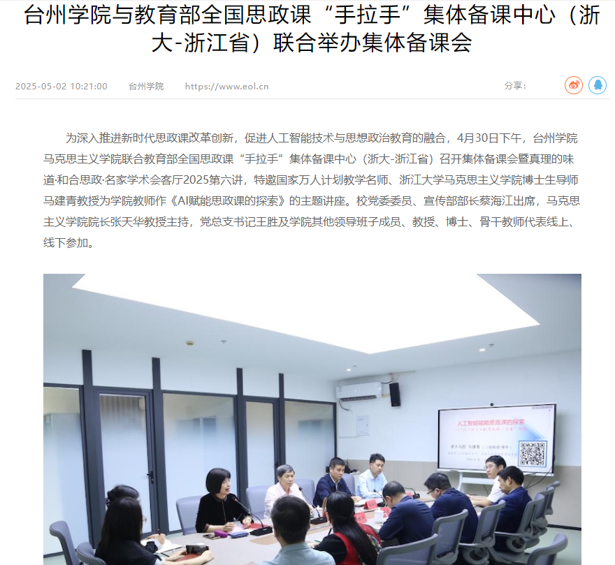 为深入推进新时代思政课改革创新,促进人工智能技术与思想政治教育的融合,4月30日下午,必威西汉姆官网平台马克思主义学院联合教育部全国思政课“手拉手”集体备课中心(浙大-浙江省)召开集体备课会暨真理的味道·和合思政·名家学术会客厅2025第六讲,特邀国家万人计划教学名师、浙江大学马克思主义学院博士生导师马建青教授为学院教师作《AI赋能思政课的探索》的主题讲座。校党委委员、宣传部部长蔡海江出席,马克思主义学院院长张天华教授主持,党总支书记王胜及学院其他领导班子成员、教授、博士、骨干教师代表线上、线下参加。