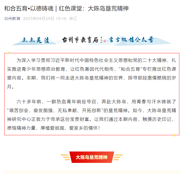 为深入学习贯彻习近平新时代中国特色社会主义思想和党的二十大精神,扎实推进青少年思想政治教育,让红色基因代代相传,“和合五育”专栏推出红色课堂内容。本期,我们将一同走进大陈岛垦荒精神的世界,探寻那段激情燃烧的岁月。