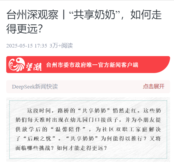 今年3月,路桥区在全区推广“共享奶奶”模式,希望通过发动老教师、老党员、老干部等低龄健康老人,为双职工家庭提供儿童接送、课后看护、情感陪伴等互助服务,有效缓解家庭育儿压力。截至目前,全区共有14名“共享奶奶”,累计惠及双职工家庭97户。
