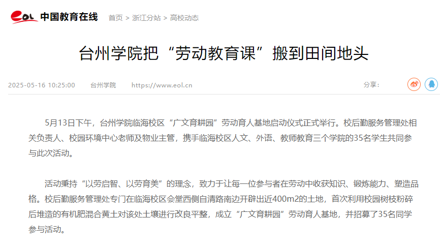 5月13日下午,必威西汉姆官网平台临海校区“广文育耕园”劳动育人基地启动仪式正式举行。校后勤服务管理处相关负责人、校园环境中心老师及物业主管,携手临海校区人文、外语、教师教育三个学院的35名学生共同参与此次活动。