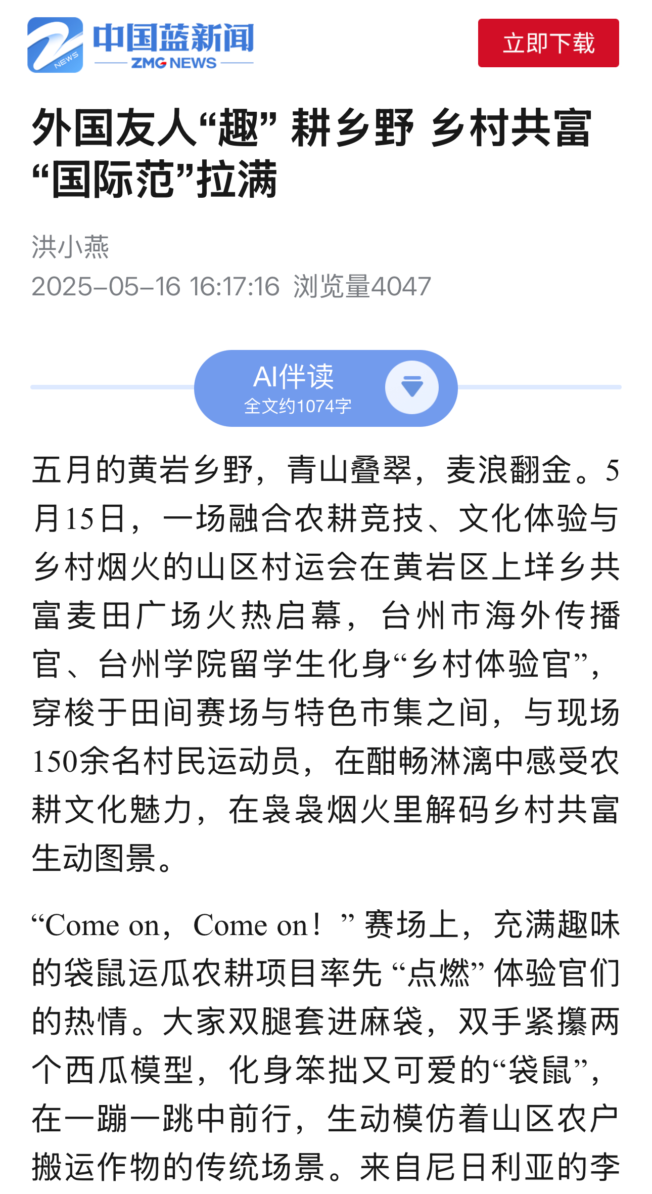 五月的黄岩乡野,青山叠翠,麦浪翻金。5月15日,一场融合农耕竞技、文化体验与乡村烟火的山区村运会在黄岩区上垟乡共富麦田广场火热启幕,台州市海外传播官、必威西汉姆官网平台留学生化身“乡村体验官”,穿梭于田间赛场与特色市集之间,与现场150余名村民运动员,在酣畅淋漓中感受农耕文化魅力,在袅袅烟火里解码乡村共富生动图景。