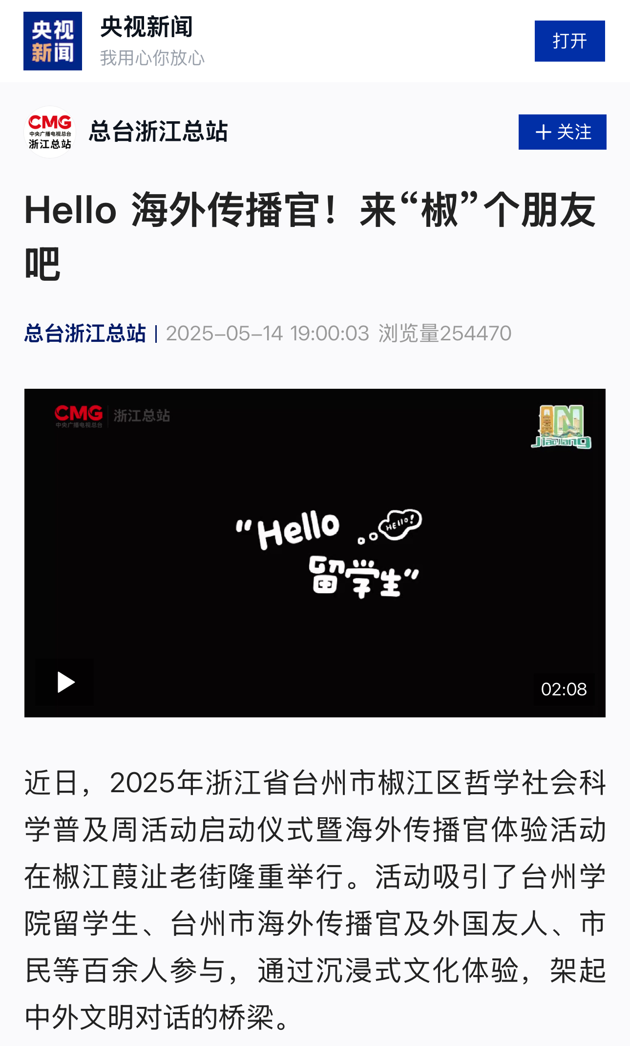 本次活动以社科普及为纽带,通过海外传播官的视角向世界讲述中国故事,是推动文化“走出去”与“引进来”双向发力的创新实践。未来,椒江区将持续深化国际传播能力建设,打造更具影响力的文化交流品牌。
