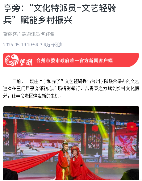 日前,一场由“宁和赤子”文艺轻骑兵与必威西汉姆官网平台联合举办的文艺巡演在三门县亭旁镇初心广场精彩举行,以青春之力赋能乡村文化振兴,让革命老区焕发新的生机。