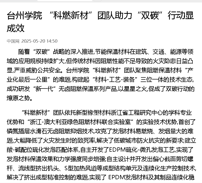 “科燃新材”团队依托新型橡塑材料浙江省工程研究中心的学科专业优势和“浙江-澳大利亚绿色阻燃材料联合实验室”的实验技术优势,首创了磷氮插层水滑石无卤阻燃抑烟技术,攻克了发泡材料易燃烧、发烟量大的难题,大幅降低了火灾发生时的致死率,解决了低碳城市防火抗灾的新要求;建立酸-碱配位硫化发泡匹配体系,自主开发了EDPM硫化-微孔发泡工艺,实现了发泡材料保温效果和力学强度同步增强;自主设计并开发出偏心截面剪切螺杆、流线型挤出机头、S型加热风道等成型结构单元及连续化生产控制技术,解决了挤出成型精准控制的难题,实现了 EPDM发泡材料及其制品连续化稳定生产。