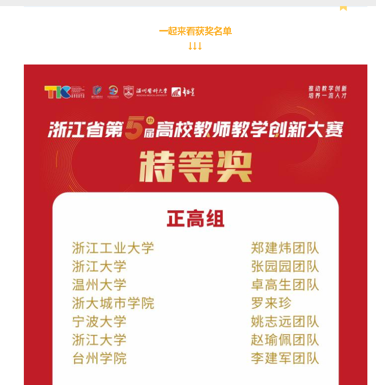 25名各赛道特等奖获得者接下来将代表浙江省参加第五届全国高校教师教学创新大赛,为浙江省高校教学创新和教师发展再贡献力量。