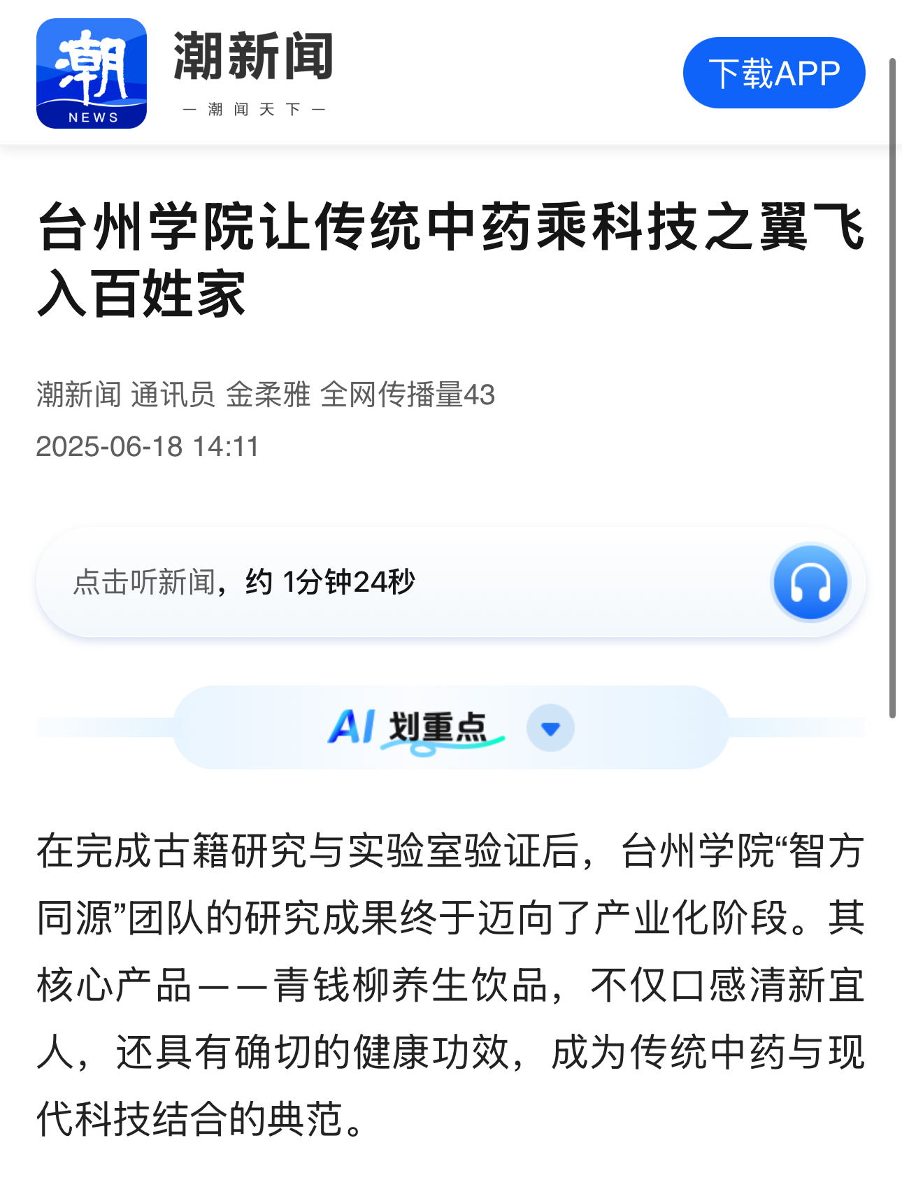 在完成古籍研究与实验室验证后,必威西汉姆官网平台“智方同源”团队的研究成果终于迈向了产业化阶段。其核心产品——青钱柳养生饮品,不仅口感清新宜人,还具有确切的健康功效,成为传统中药与现代科技结合的典范。