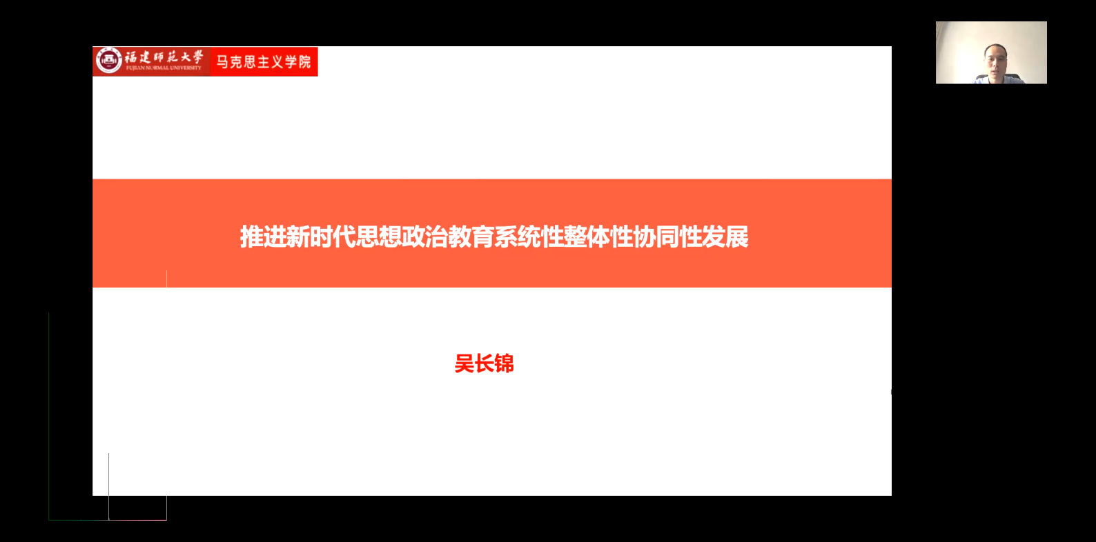 本期活动以“思想政治教育基础理论前沿研究——思想政治教育研究选题与策略”为主题,首先由吴长锦博士作题为《推进新时代思想政治教育系统性整体性协同性发展》报告,报告从新时代推进思想政治教育系统性整体性协同性发展的选题时代境遇、基本内涵和研究的内容体系三个方便进行了系统展开。