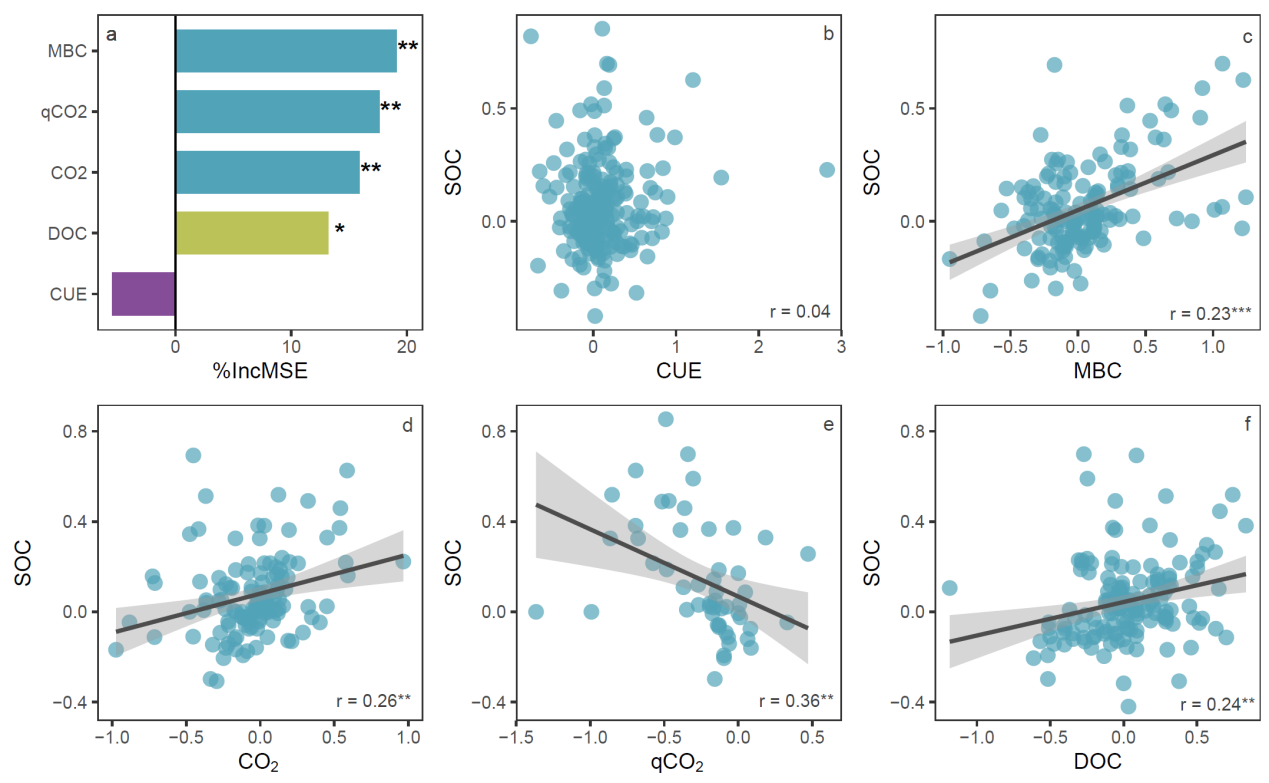 研究结果表明,养分添加使土壤微生物CUE增加了11.5%。添加养分的特征、生态系统及气候因子均能影响微生物CUE对养分添加的响应规律。养分输入后土壤氮素可用性和碳氮周转相关酶活性与微生物CUE分别呈显著正和负相关。值得注意的是,养分添加提高了微生物源碳的输入,促进了土壤碳积累,但微生物CUE与SOC呈现解耦关系,养分添加时微生物CUE对SOC的贡献并非人们认为的那样重要。该研究加深了全球范围内养分添加对微生物CUE的理解,并强调需要进行更多的研究关注微生物CUE在SOC固存中的作用。