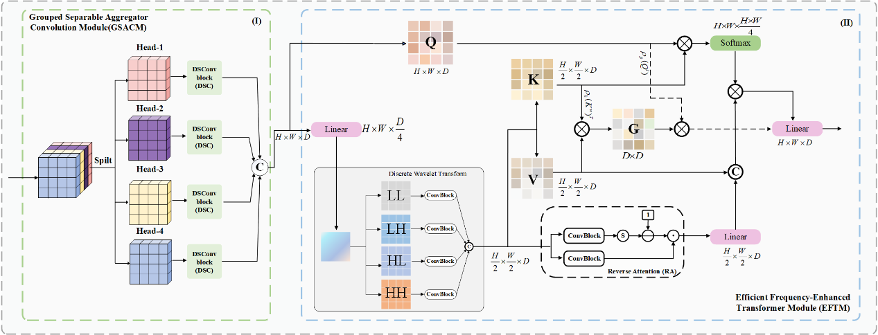 图2 分组可分离聚合卷积模块(GSACM)和高效频率增强Transformer模块(EFTM)