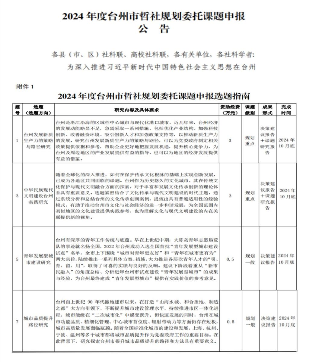 日前,市社科联发布了2024年度市哲社规划委托课题申报公告,全市共有10项选题(选题方向)入选。电玩城app官网下载智库平台台州市战略发展研究中心选送的课题独中四元,其中2项为重点委托课题,选题涉及新质生产力研究、青年发展型城市研究、城市品质研究、中华民族现代文明研究等。