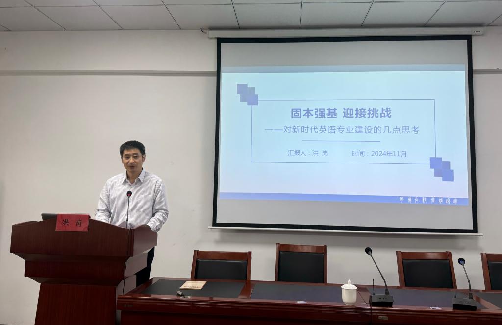 11月14日,外国语学院邀请了洪岗教授作题为“固本强基、迎接挑战——对新时代英语专业的若干思考”的学术讲座。洪岗教授是教育部高等学校外国语言文学类专业教学指导委员会委员、英语专业教学指导分委员会副主任委员、中国翻译协会副会长、教育部“国培计划”专家库成员。本次讲座旨在探讨在“一带一路”倡议提出十周年之际,英语专业如何创新发展、特色发展、高质量发展,以应对当前教育和社会的新挑战。